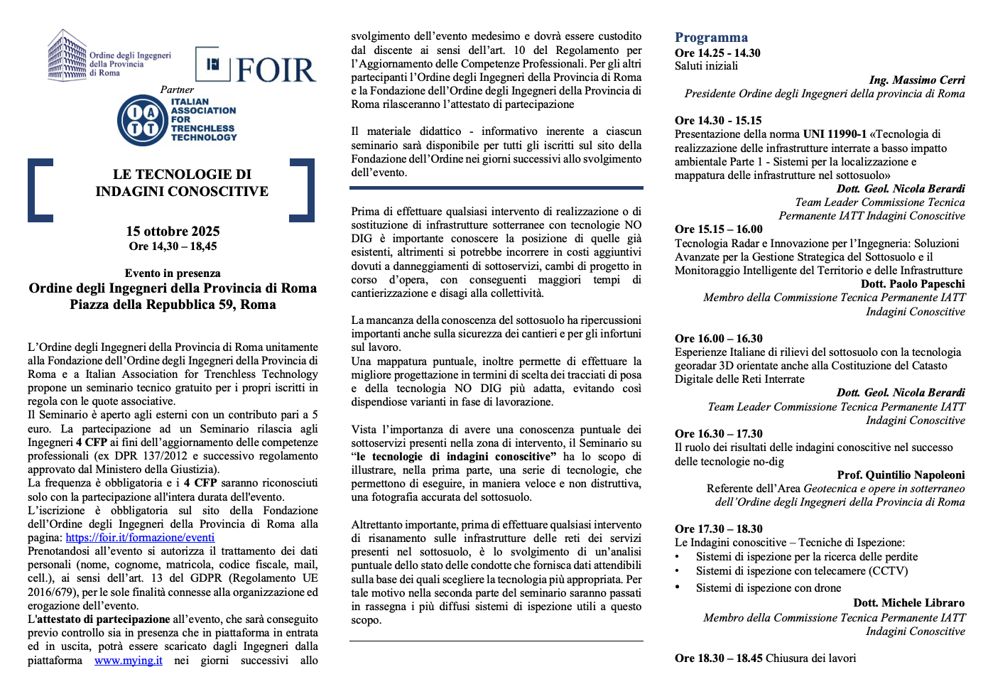 Il Seminario su “le tecnologie di indagini conoscitive” ha lo scopo di illustrare, nella prima parte, una serie di tecnologie, che permettono di eseguire, in maniera veloce e non distruttiva, una fotografia accurata del sottosuolo.