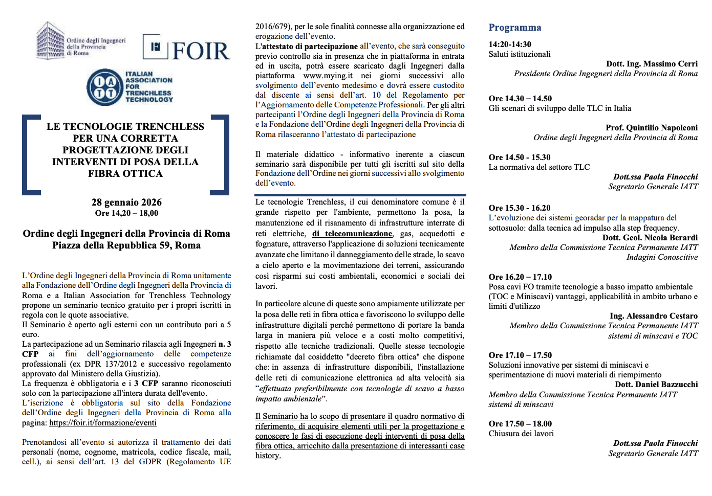 Il Seminario ha lo scopo di presentare il quadro normativo di riferimento, di acquisire elementi utili per la progettazione e conoscere le fasi di esecuzione degli interventi di posa della fibra ottica, arricchito dalla presentazione di interessanti case history.